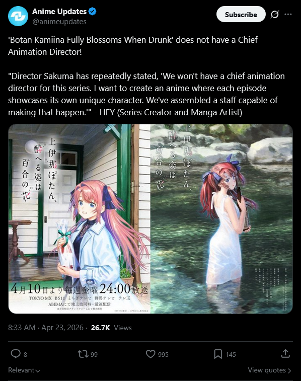 Screenshot 2026-04-23 at 14-31-17 (1) Anime Updates on X 'Botan Kamiina Fully Blossoms When Drunk' does not have a Chief Animation Director! Director Sakuma has repeatedly stated 'We won't have a chief animation director for[...].png
