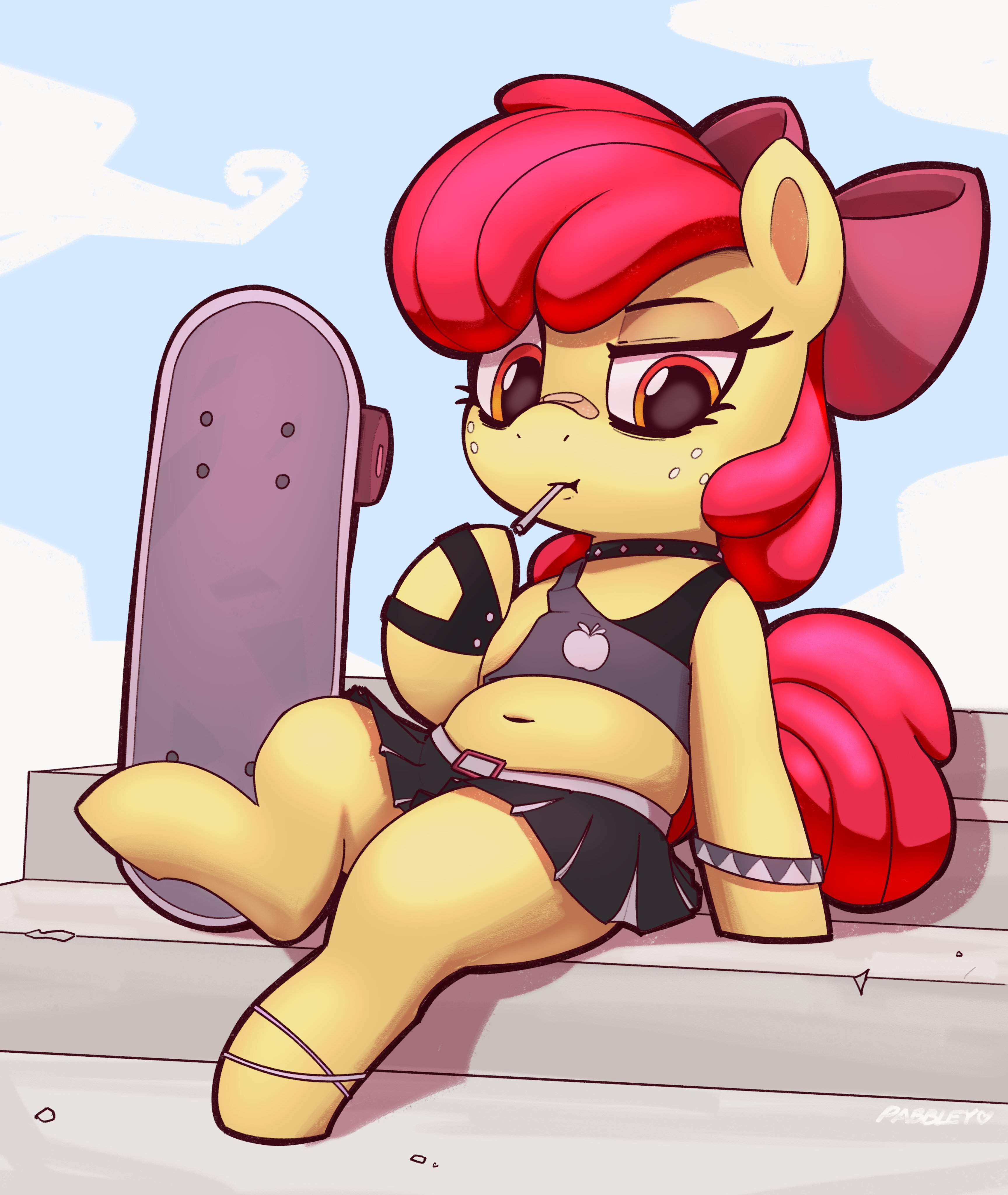 3517360__safe_artist-colon-pabbley_apple+bloom_earth+pony_semi-dash-anthro_g4_anklet_apple+print_band-dash-aid_band-dash-aid+on+nose_belly_belly+button_belt_bow.jpg