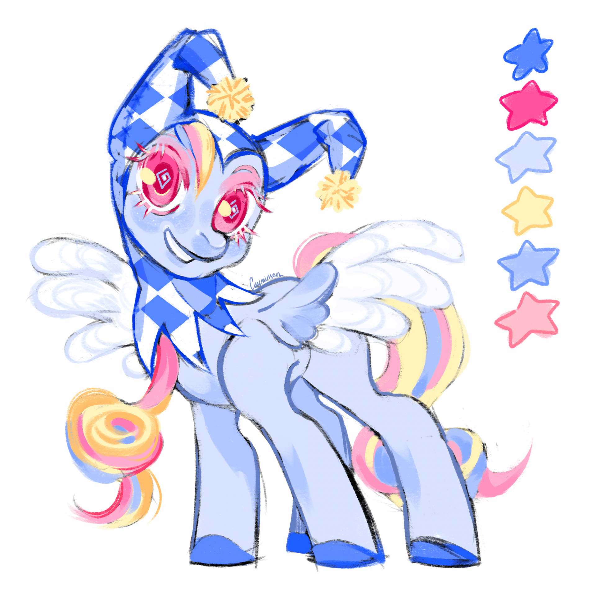 2490117__safe_artist-colon-bestiary_oc_oc+only_oc-colon-evening+prose_pegasus_pony_clown_clown+makeup_female_freckles_jester_mare_solo.png