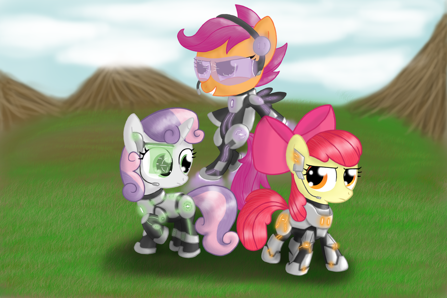 887258__safe_artist-colon-ponyus94_apple+bloom_scootaloo_sweetie+belle_cyborg_g4_cutie+mark+crusaders_hmd_power+armor.png